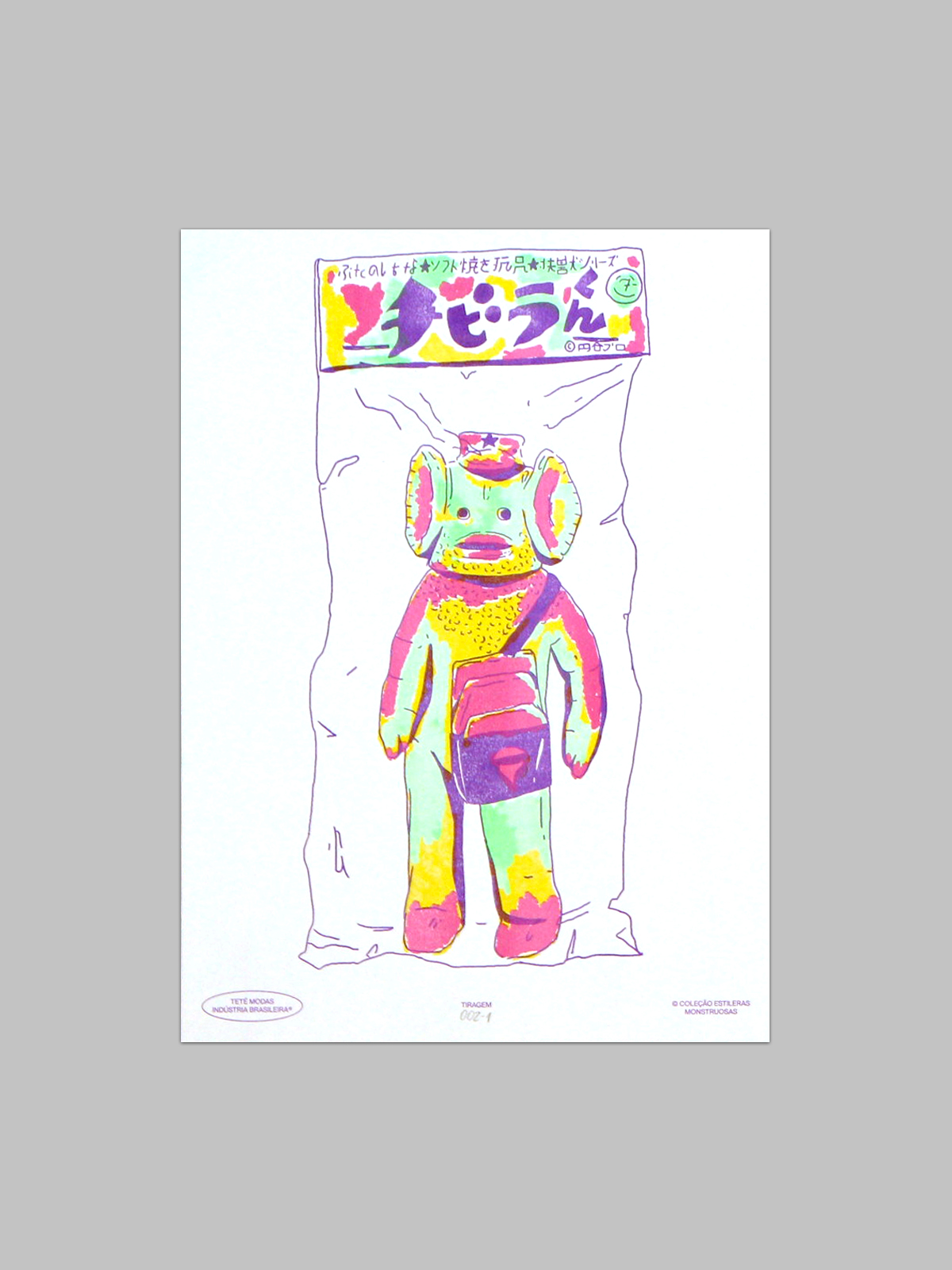 Inspirado em bonecos de ação japoneses, o cartaz "Monstrinho" tem 29,7 x 42 cm (tamanho A3) e é impresso em risografia quatro cores, no papel polén bolg 90g. A risografia tem uma textura super charmosa, e o cartaz é o pontinho de cor que faltava na sua casa. O impresso faz parte da "© Coleção estileras monstruosas", recomendado pros posturados.